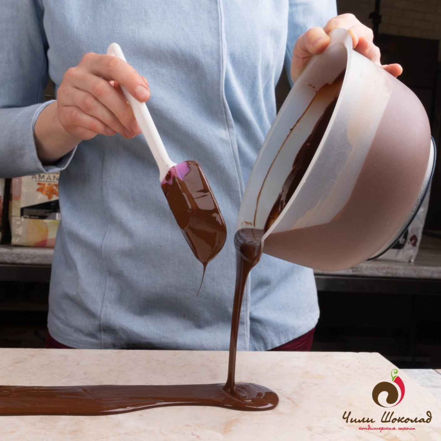 Если вы шоколад чуть перегрели. Что ж, со всяким бывает. Добавьте горсть нерастопленных калет и пробейте блендером, чтобы температура шоколада опустилась ниже предельной. Но это работает, только если буквально на пару градусов перегрели. Если намного — пиши пропало, придется темперировать сложным способом: нагреть, быстро охладить, снова нагреть.