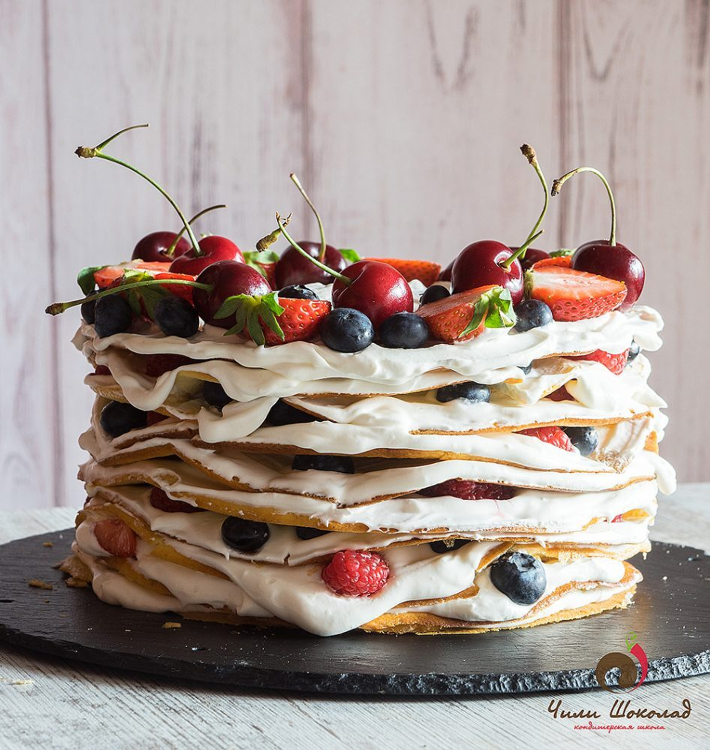 Прослаиваем коржи, выкладывая на каждый по 70 г крема. Краешек посыпаем ягодами для красоты. Если ягод много, можно и между коржами добавить.