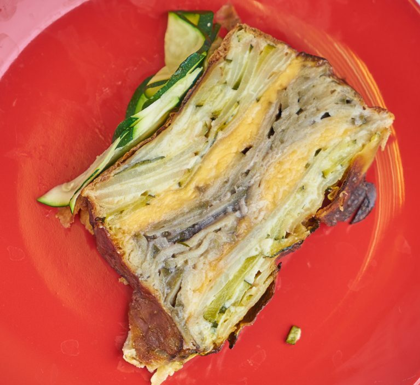 Обратите внимание, что здесь используется оранжевый сыр чеддер. Принципиально брать именно оранжевый. На разрезе его видно, и разрез получается совершенно восхитительный. Для эстетических же целей лучше брать не белые кабачки, а зеленые цуккини, чтобы на разрезе была видна зеленая корочка. Но это необязательно.