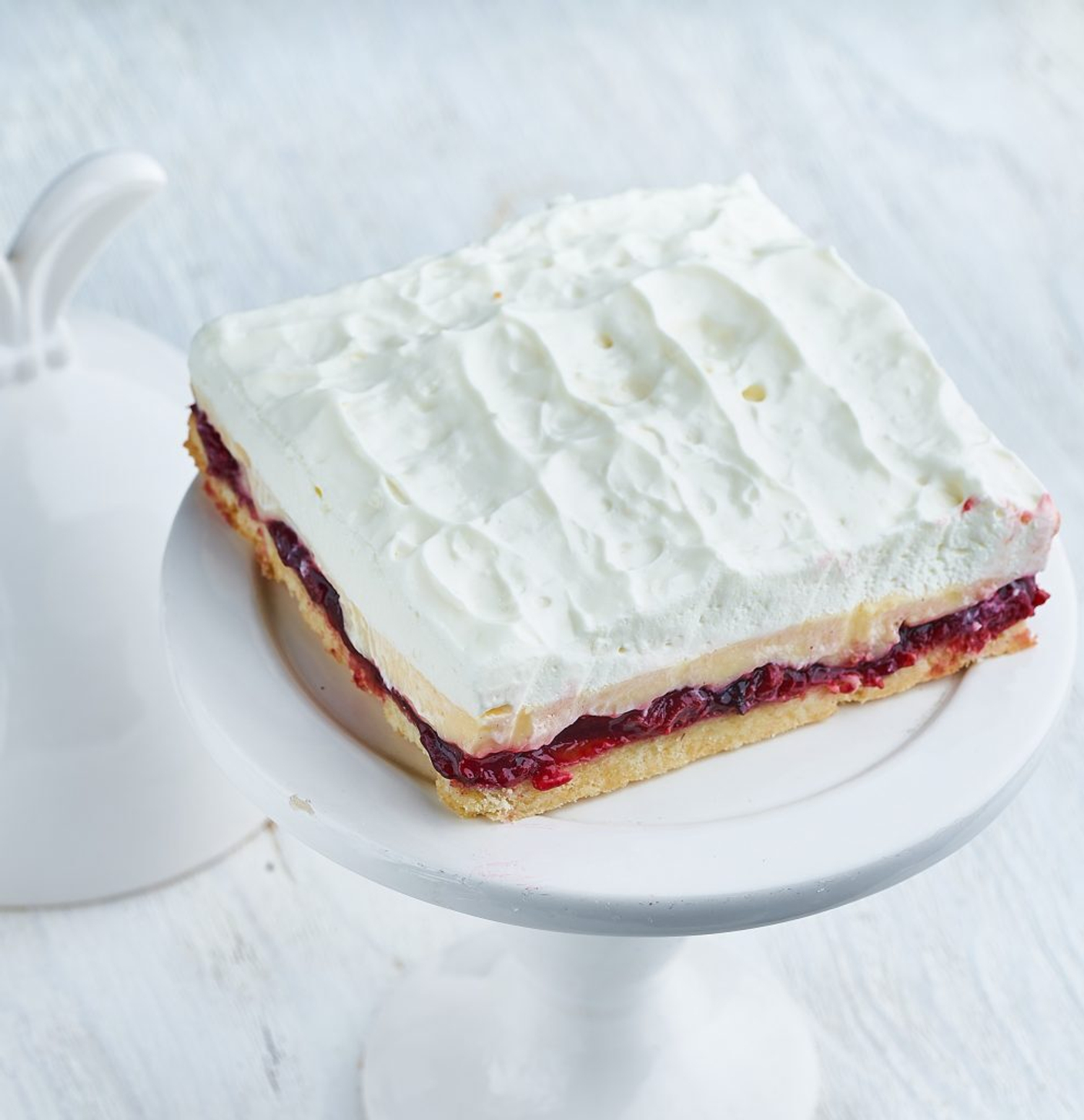 Я не уверена, что именно в кофиксе я встречала это пирожное, но однозначно похожий десерт распространен в московских бюджетных кофейнях. Мне очень понравилась идея такого десерта: песочное тесто, ягодный слой, заварной крем, а сверху взбитые сливки. Дополнительный акцент пирожному придает примешанная к взбитым сливкам клюква с ее характерной горчинкой.
