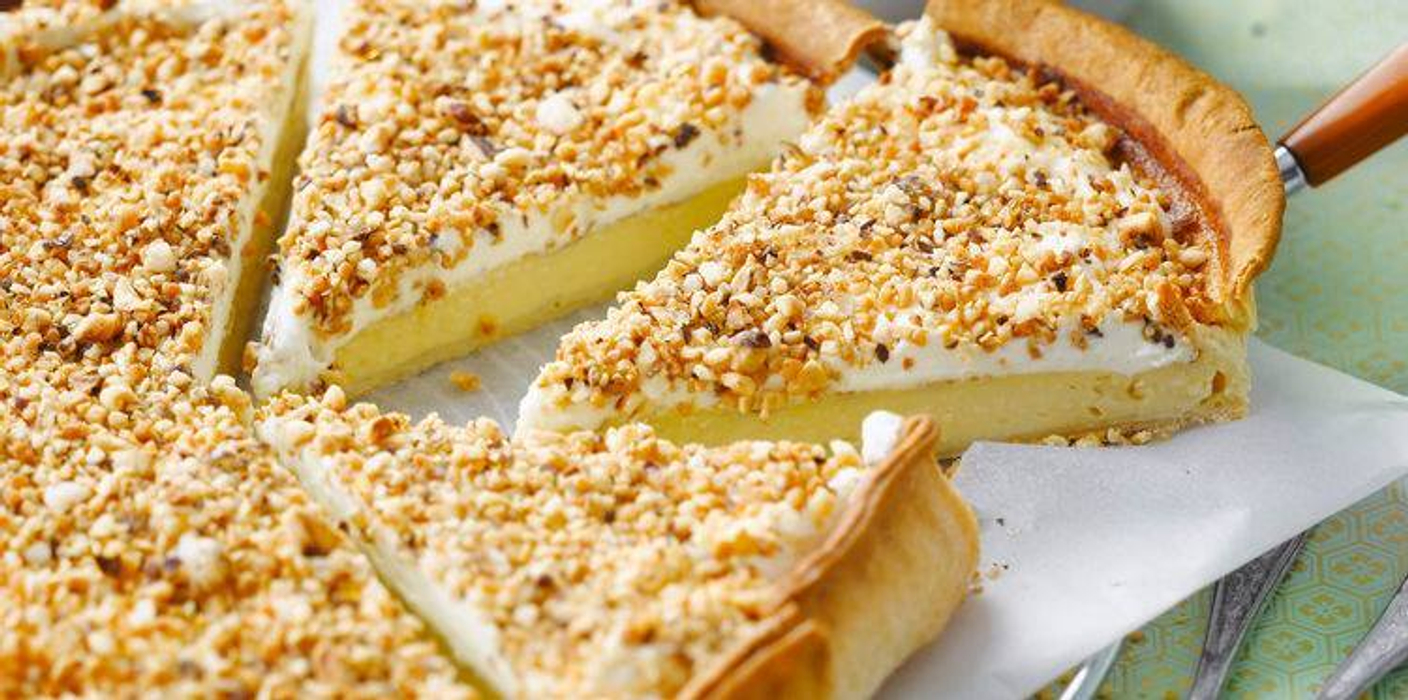 Это тесто типа бриошь, на нем заварной крем, сверху взбитые сливки, и все это посыпано карамелизованным лесным орехом. Вкуснота неописуемая!