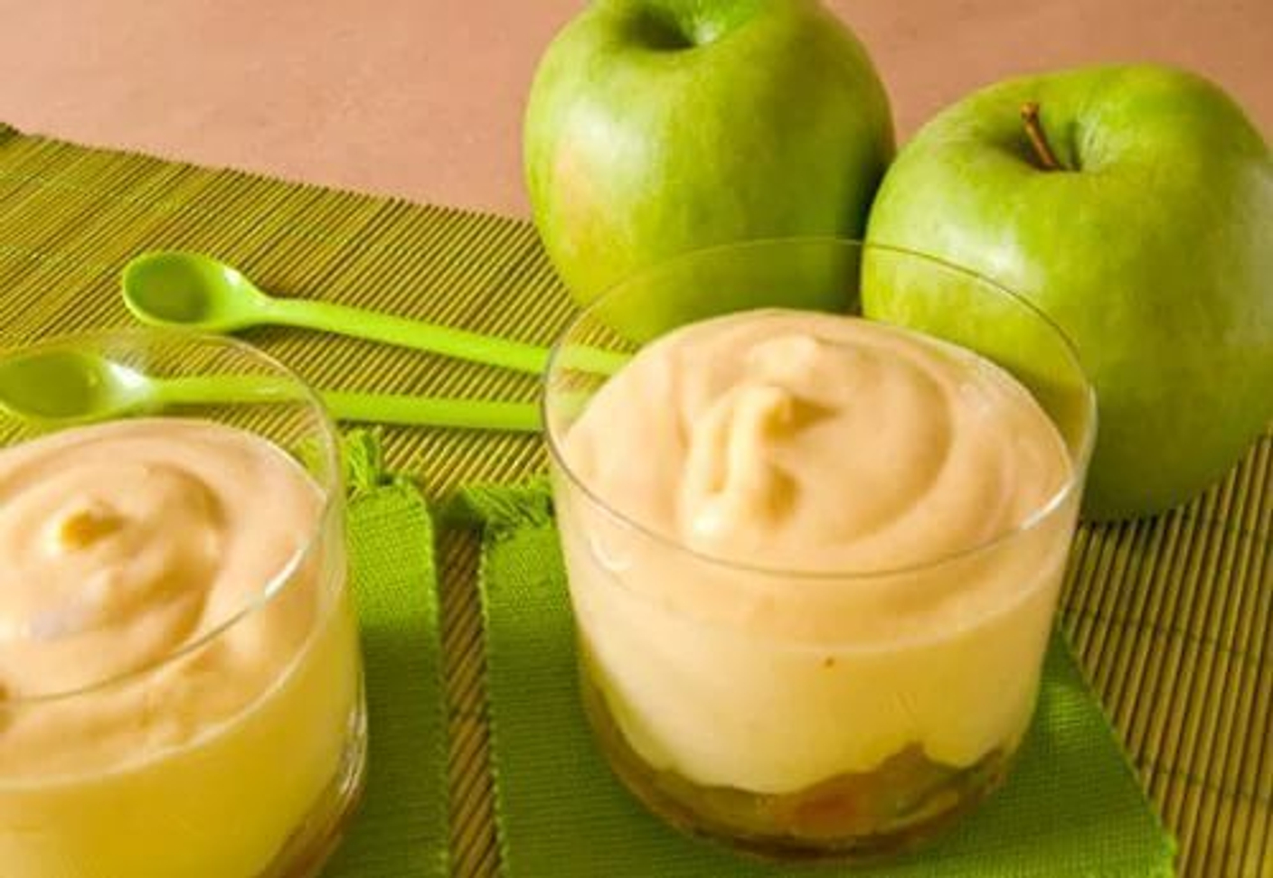 Собственно все. Выкладываем мусс с яблоками в стаканы или креманки. В зависимости от формы и размера ваших сосудов можно яблоки положить на дно или слоями. Яблоки уже холодные должны быть, конечно. Сверху тоже можно положить яблоки, если они у вас не разварились и выглядят аппетитно. Закрываем верх креманок пищевой пленкой и в холодильник часа на два. За это время мусс застынет и десерт готов!