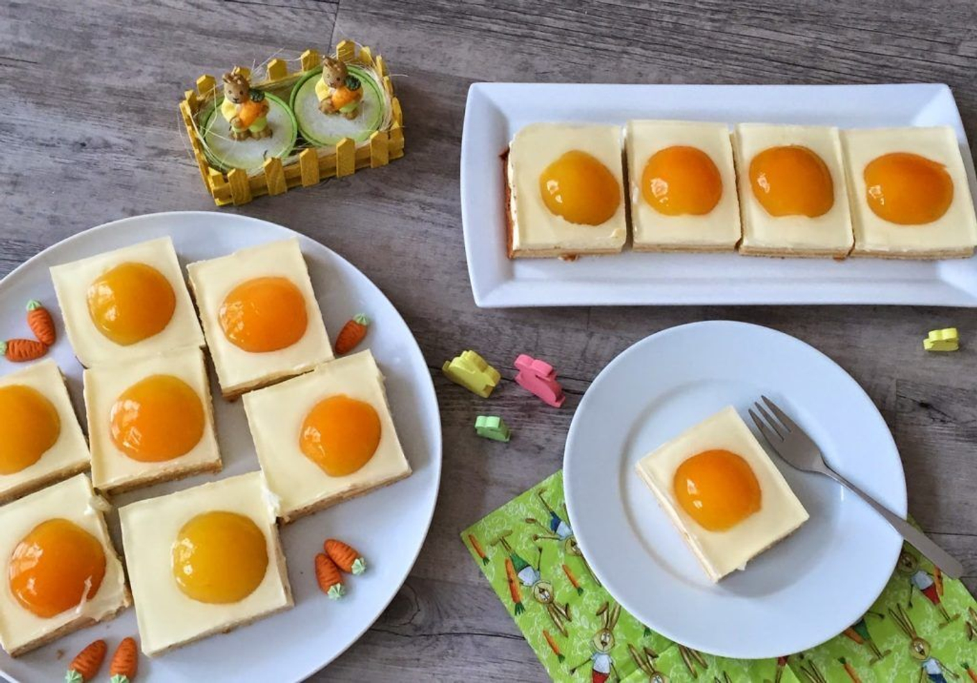 Самое оригинальное в этом пироге, конечно же, вид яичницы! Он достигается при помощи банки консервированных абрикосов. Почему консервированных? Они не вянут, не темнеют, сохраняют красивый оранжевый цвет.