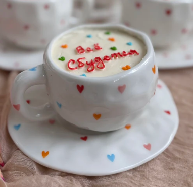 По завершении мастер-класса вы заберете с собой не только вкусный тортик, но и кружку с блюдцем с сердечками (объём 300 мл), которая будет радовать Вас еще долгое время.